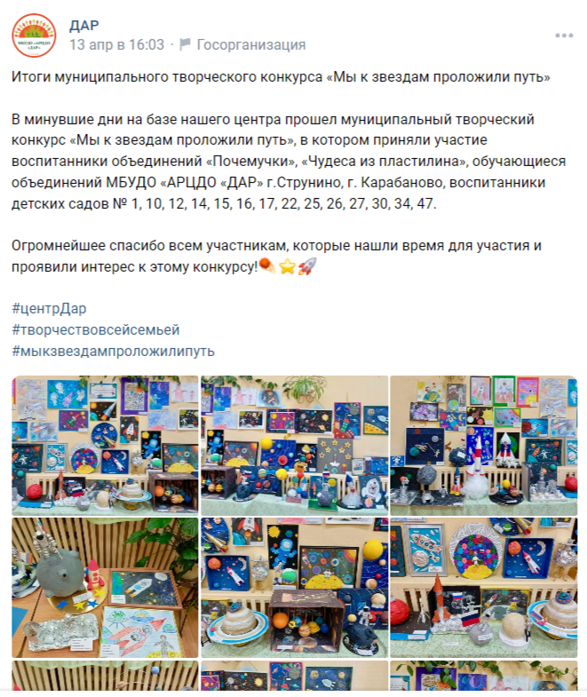 минувшие дни на базе нашего центра прошел муниципальный творческий конкурс «Мы к звездам проложили путь», в котором приняли участие воспитанники объединений «Почемучки», «Чудеса из пластилина», обучающиеся объединений МБУДО «АРЦДО «ДАР» г.Струнино, г. Карабаново, воспитанники детских садов № 1, 10, 12, 14, 15, 16, 17, 22, 25, 26, 27, 30, 34, 47.