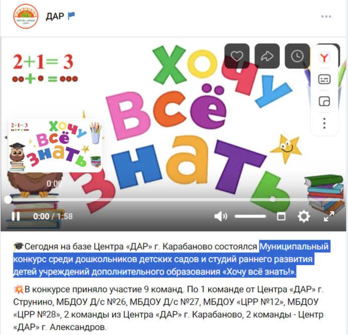 Сегодня на базе Центра «ДАР» г. Карабаново состоялся Муниципальный конкурс среди дошкольников детских садов и студий раннего развития детей учреждений дополнительного образования «Хочу всё знать!».