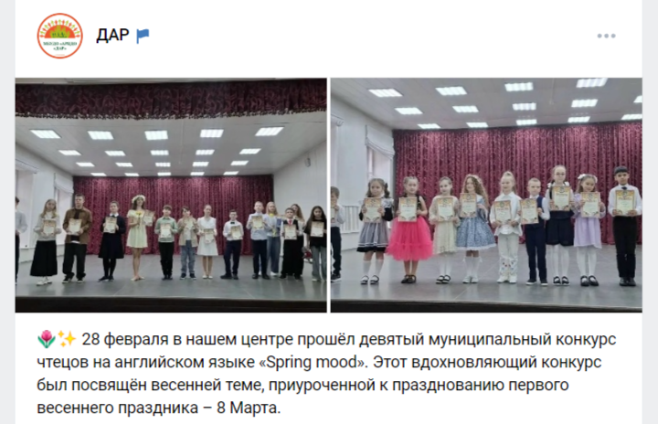 28 февраля в нашем центре прошёл девятый муниципальный конкурс чтецов на английском языке «Spring mood». Этот вдохновляющий конкурс был посвящён весенней теме, приуроченной к празднованию первого весеннего праздника – 8 Марта.