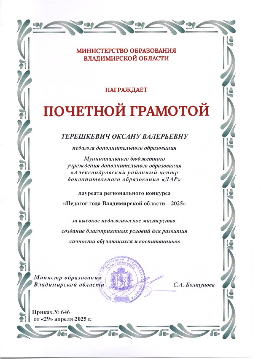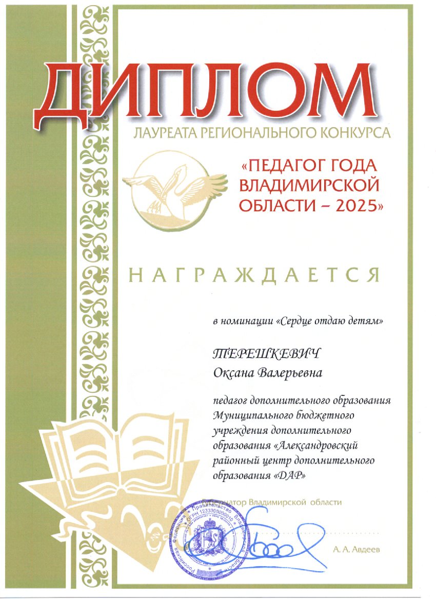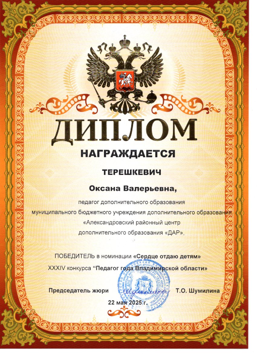 Дорогие друзья! Рады сообщить, что наш педагог, Терешкевич Оксана Валерьевна, стала победителем регионального конкурса «Педагог года Владимирской области»!